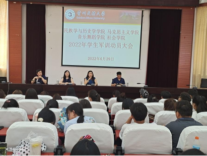 2022-06-302022年6月29日,民族学与历史学院、马克思主义学院、音乐舞蹈学院、BETWA西汉姆联在花溪校区15栋圆形会议室联合开展2022年学生军训动员大会。民族学与历史学院党委书记唐懈、音乐舞蹈学院党委书记陈懿、BETWA西汉姆联党委书记李黎、马克思主义学院党委副书记徐勤山出… -