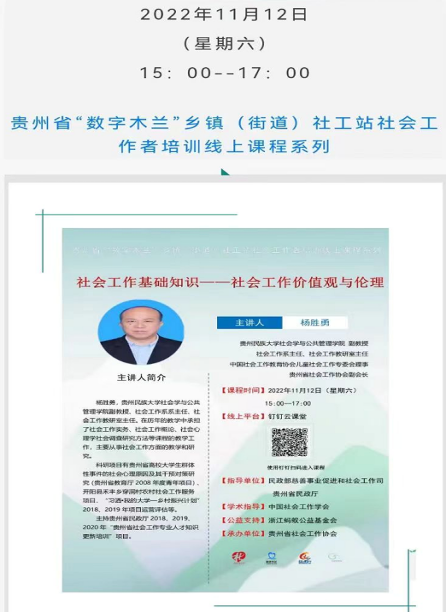 2022-11-14 2022年11月12日,我院社会工作系系主任杨胜勇副教授受贵州省社会工作协会邀请,为贵州省“数字木兰”乡镇(街道)社工站社会工作者开展第五期线上培训。此次培训的主题是“社会工作基础知识——社会工作价值观与伦理”。杨胜勇老师采取理论知识+案例分享… -
