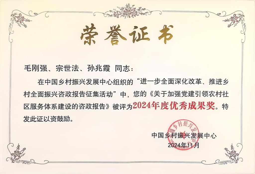 2025-01-06近日,我院毛刚强团队撰写的《关于加强党建引领农村社区服务体系建设的咨政报告》被中国乡村振兴发展中心采纳,并荣获“2024年度优秀成果奖”。中国乡村振兴发展中心是农业农村部直属、公益一类正局级事业单位。该团队针对当前“农村社区服务”领域中的热点… -