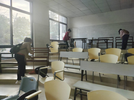 学员们对教室进行了全面的清扫,清除了地面上的垃圾、纸屑和灰尘,擦拭了桌椅板凳的表面,将教室打扫得一尘不染。大家动作迅速、协作默契,展现出了良好的团队合作精神。