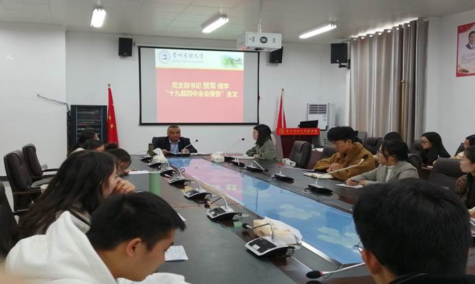在全省上下举行“不忘初心、牢记使命”主题教育下,本科生第一党支部坚持读原著,学原文,悟原理的办法,由党支部书记贺军同志领学十九届四中全会报告全文。同时,领学开始之前,贺军同志对会议纪律作要求,希望各位同志要发挥党员的战斗堡垒作用,在生活中、学习中要严守纪律高压线。