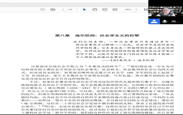 2021年10月21日下午15:00-17:30,BW·西汉姆联特聘教授、南京大学周晓虹教授继续“空中讲堂”通过“腾讯会议”线上为我院社会学、社会工作硕博研究生开展了“社会学理论与经典文献选读”学术讲座的第二讲——迪尔凯姆:社会主义的巨擘。我院教师及社会学、社会工作硕博研究生线上同步参加。
