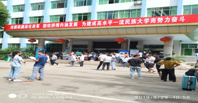 在迎新工作正式开始之前,团委学生会成员做了充分准备,包括张贴横幅、搬运座椅、布置迎新点等。迎新工作正式开始之后,团委学生会成员登记新生注册填写信息表、带领新生办理入学手续,入住寝室,减少新生们的不必要的时间成本。2019年8月27日下午四点,我院花溪校区团委学生会成员在迎新点开展迎新工作,27日的迎新工作于晚上七点左右结束。2019年8月28日上午八点,全校的迎新工作正式开始,我大学城校区的部分成员和花溪校区的团委学生会全体成员共同参加了此次迎新工作。