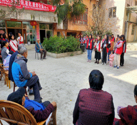 本次活动中,各个参与的志愿者都很积极。我们到敬老院时老人们正在闲坐着。于是我们的志愿者按照负责人的安排,将我们所准备的礼物送给爷爷奶奶们,开始亲密的跟老人互动,有陪老人下棋的,有陪老人聊天的,也有为老人按摩的,还有些同学帮忙打扫卫生。随后就是我们的表演环节,有唱歌、朗诵、舞蹈。老人们也积极参与其中,其乐融融。节目表演的最后一个环节是以同学们和老人们一同跳广场舞结束此次的活动。
