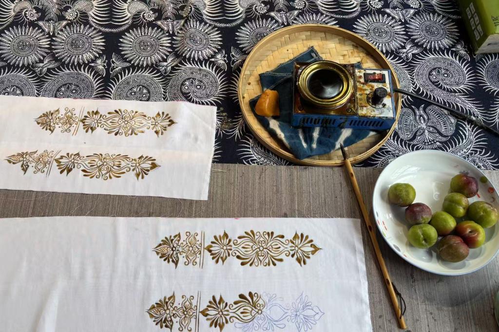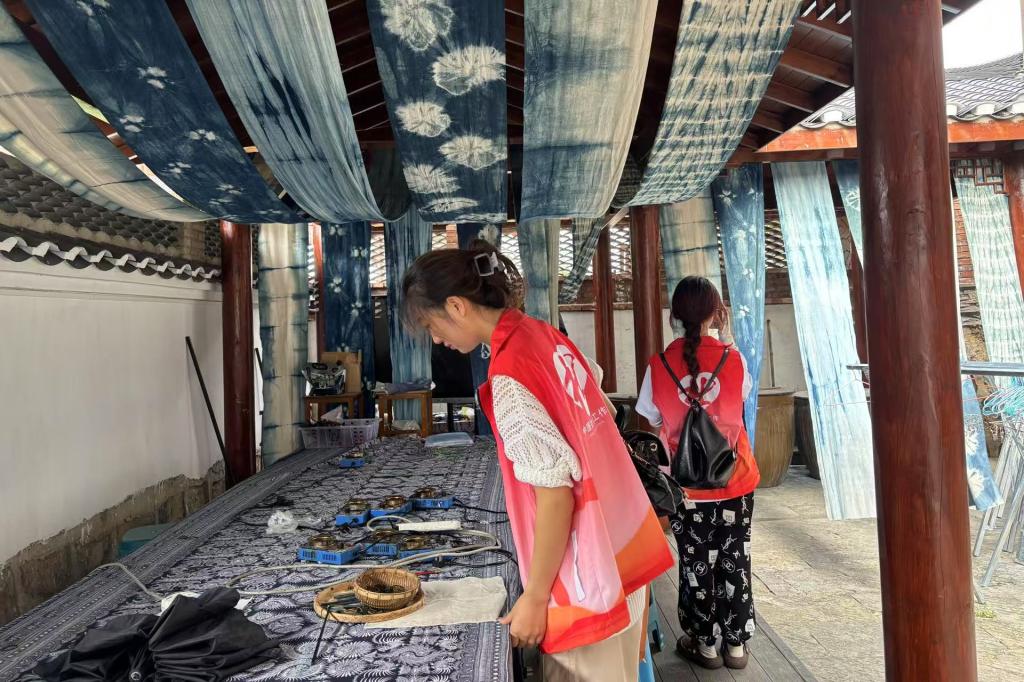 志愿团漫步青石板路,探访百年古龙井、千年古槐树,并跟随贵阳市非遗“豆染”技艺传承人学习豆染技艺。据村支书介绍:“龙井村保留着完整的布依族干栏式建筑群,近年来通过‘非遗工坊+研学游’模式,让老技艺焕发新生机。”