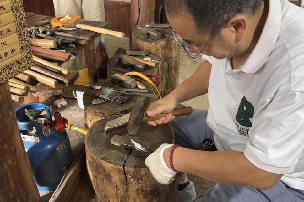 图3 志愿团成员观摩传承人錾刻银饰并与之交谈