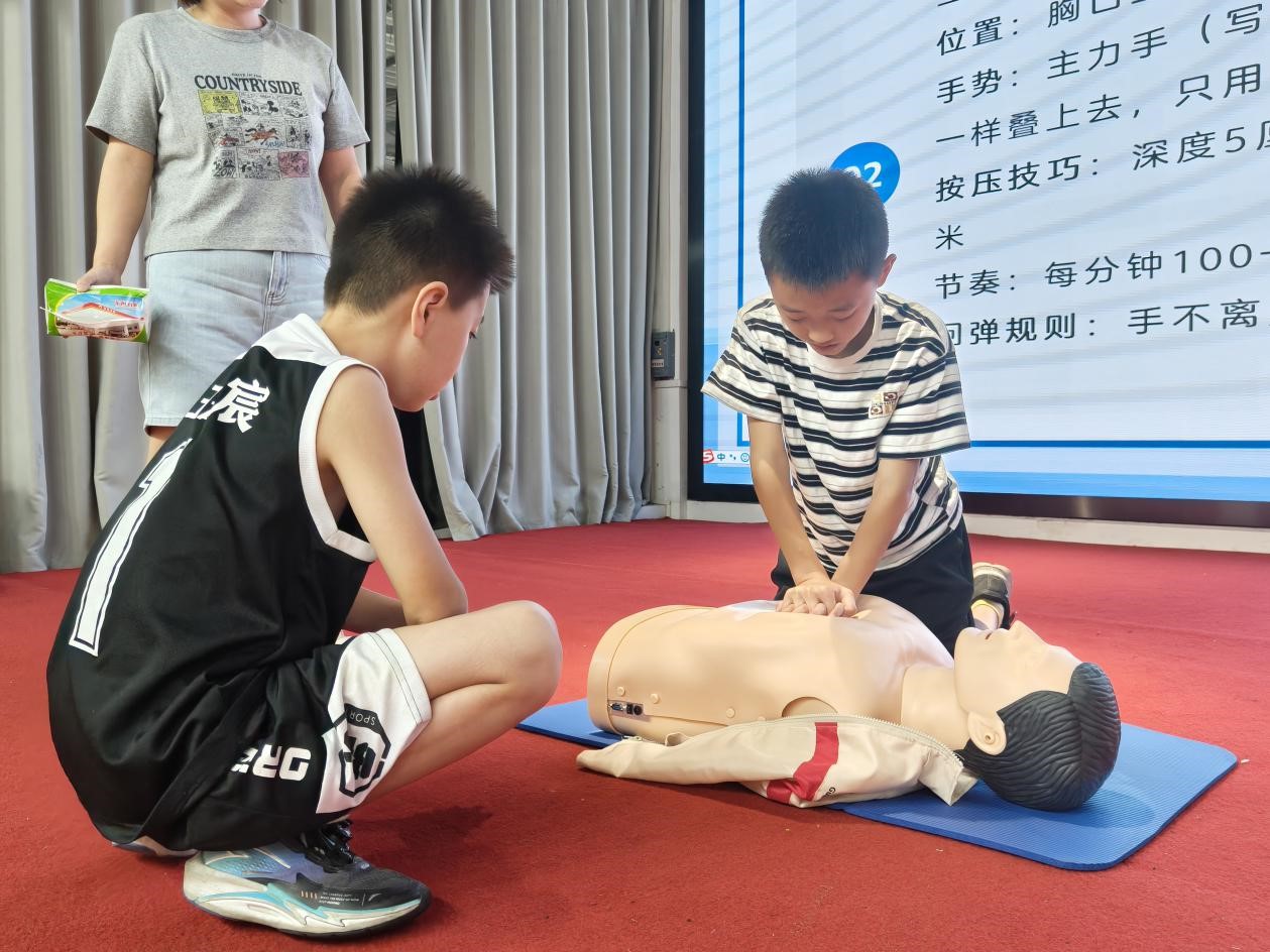8月1日,宣讲团以“理论宣讲+急救培训”的活动形式展开宣讲。宣讲员陈龙礼结合《那年那兔那些事儿》短片,讲述四渡赤水与长征故事,引导孩子们以绘画诠释心中“那兔”形象,以“看、听、绘”三位一体的沉浸式体验,让红色精神浸润童心;宣讲员曹宸瑜、蒋欣蕊通过模拟演示、实操互动,教授海姆立克急救法与心肺复苏技能,将“守护生命”理念植入青少年心中。