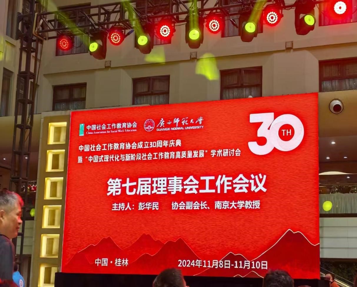 2024年11月8日-10日,“中国社会工作教育协会成立30周年庆典暨中国式现代化与新阶段社会工作教育高质量发展学术研讨会”在广西桂林隆重举行。此次年会吸引了来自全国各地高校、科研机构、社会组织以及相关政府部门的众多专家、学者、教育工作者和一线社工齐聚一堂,共同探讨中国社会工作教育领域的最新发展动态、面临的挑战与未来发展方向。为深入贯彻习近平总书记关于社会工作的重要论述,积极推动我院社会工作学科高质量发展与人才培养体系完善,我院副院长卫松教授、娄世桥副教授带队前往参加此次会议,与来自全国各地的社会工作教育专家共同探讨我国社会工作教育的发展。