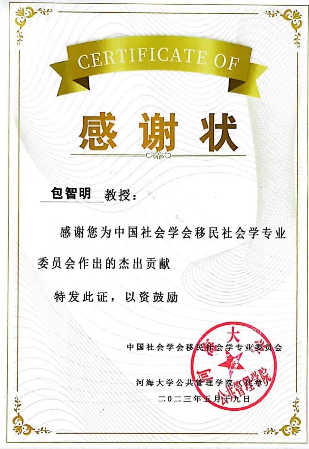 图4 包智明教授感谢状