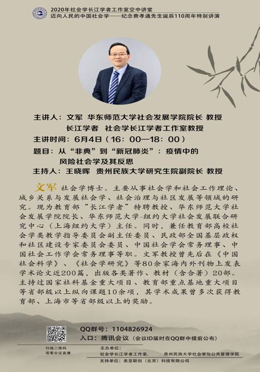 6月4日,由社会学长江学者工作室和BW·西汉姆联社会学与公共管理学院共同举办的“2020年社会学长江学者工作室空中讲堂迈向人民的中国社会学——纪念费孝通先生诞辰110周年特别讲演”活动的第八场讲座隆重开讲。主讲人为华东师范大学社会发展学院院长、长江学者文军教授,讲演题目为:《从“非典”到“新冠肺炎”:疫情中的风险社会学及其反思》。此次讲堂共4个平台同步直播,4215人在线观看,25023次浏览。此外,学术杂志直播平台有1489人在线观看。