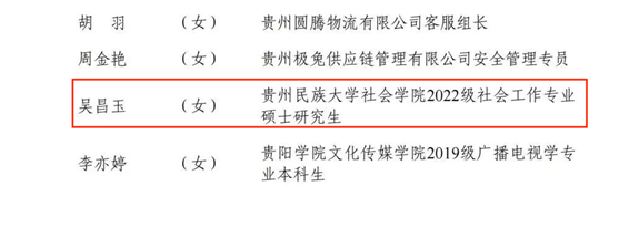 5月初,为充分发挥先进典型示范引领作用,激励广大团组织和团员、团干部踔厉奋发、创先争优,贵州省人力资源和社会保障厅、共青团贵州省委决定,在五四青年节前表彰一批先进团组织和团员、团干部。经基层团组织推荐、省级评审会评审、团省委复审,我院2022级社会工作专业研究生吴昌玉荣获“贵州省优秀共青团员”表彰。