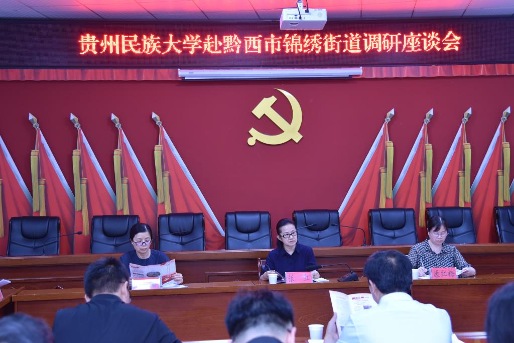 6月1日下午,调研组与黔西市锦绣街道办事处社区有关干部在锦绣社区会议室开展调研座谈会。锦绣社区作为黔西市最大的易地扶贫搬迁安置点,安置了来自黔西市24个乡镇的易搬群众4044户17902人,其中脱贫户3726户16632人,是一个由汉、彝、苗、布依、仡佬等18个民族组成的全新大家庭。座谈会上,社区干部向调研组介绍了锦绣社区的基本情况,详细分享了他们在智慧社区建设、公共文化建设、社区治理上的成功经验。调研期间,团队成员积极向社区干部请教,锦绣社区的干部们热情地回应同学们的疑问,一问一答互动,现场气氛十分活跃。