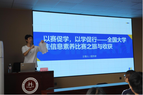 随后培训过程中,2023级社会工作专业胡沛卓同学结合自身参赛时围绕AI信息检索、数据处理与分析等比赛核心环节的经历,生动分享实战心得。他详细讲述如何高效利用AI工具精准获取信息,怎样对庞杂数据进行梳理与分析以支撑竞赛项目,为同学们提供了极具价值的实战经验参考,让大家对参赛有了更直观的认知。